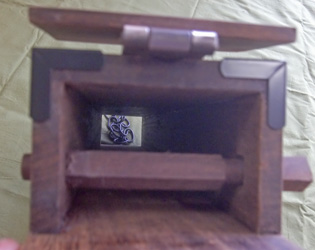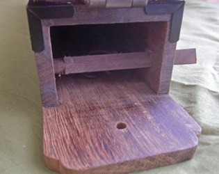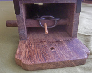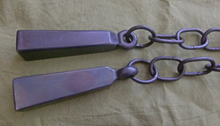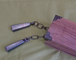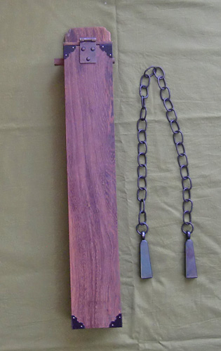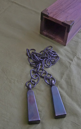 普段は何でもない箱だが、横に出ている棒を押すと下から(中で掛けてある)万力鎖が飛び出してくる仕掛けになっている。鎖も昔通り「わかし付け」で作ってあり振り回しても鎖が外れる事は無い。昔通りに手造りで再現した物で数は5組しか無いので武道愛好家にはお薦めする。