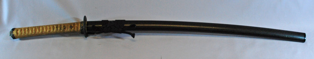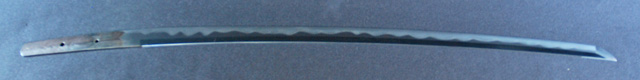 刀長 68.5cm(2尺2寸6分) 反り 1.5cm(5分) 元幅 3.06cm 先幅 2.31cm 元重 7.2mm 先重 5.2mm  刀身重量 裸身 750g  鞘を払って 1,030g  摺上   目釘穴 2  刃文 大乱刃 価格