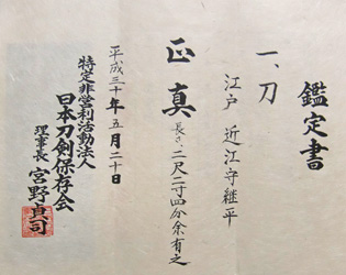 江戸住三代康継の門にして藤田与兵衛と称す。地金小板肌良く練れ刃紋小互ノ目、小足良く入り出来が良い。