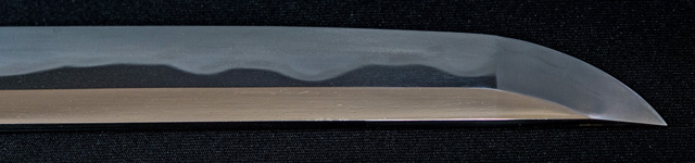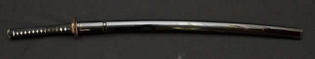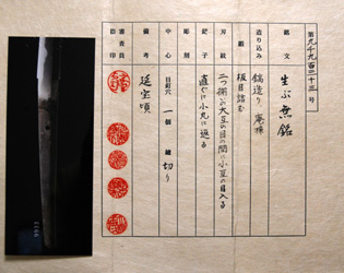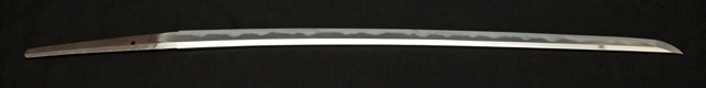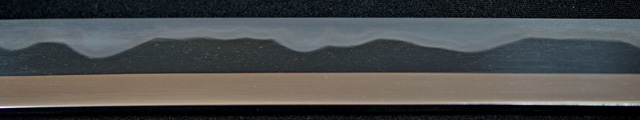 刀長 72.1cm(2尺3寸8分) 反り 1.0cm(3分3厘) 元幅 2.98cm 先幅 2.39cm 元重 7.6mm 先重 4.9mm  刀身重量 裸身 750g  鞘を払って 1,050g  生  目釘穴 1  刃文 互ノ目乱 価格
