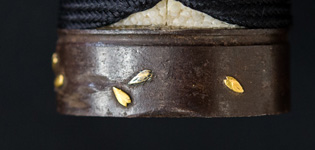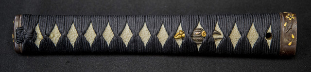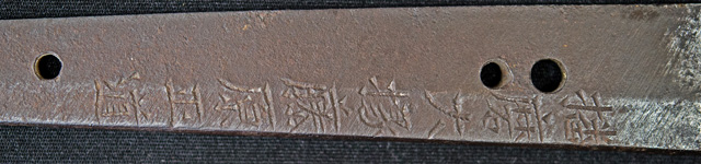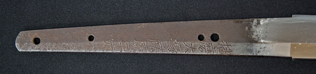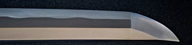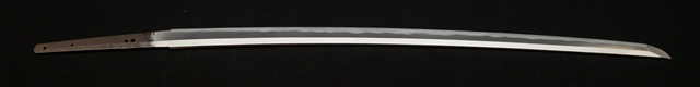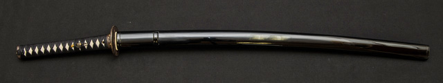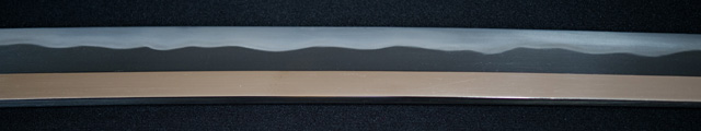 | 刀長 70.5cm(2尺3寸3分) 反り 1.3cm(4分3厘) 元幅 3.17cm 先幅 2.41cm 元重 6.5mm 先重 4.8mm 刀身重量 裸身 730g 鞘を払って 1,080g 茎 生 目釘穴 4 刃文 互ノ目乱 |