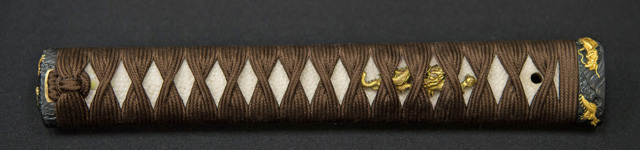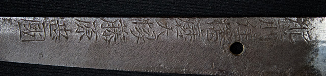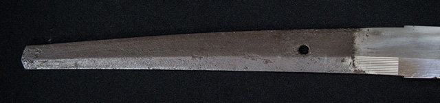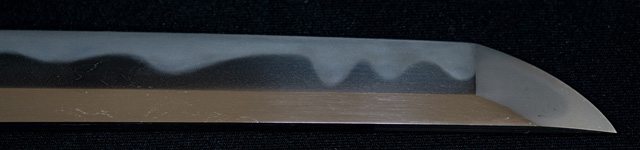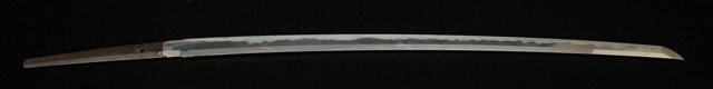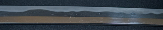 刀長 72.7m(2尺4寸) 反り 1.2cm(4分) 元幅 3.17cm 先幅 2.36cm 元重 6.5mm 先重 4.3mm  刀身重量 裸身 700g  鞘を払って 1,000g  茎 生  目釘穴 1  刃文  乱刃 価格