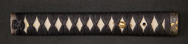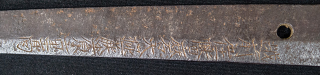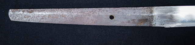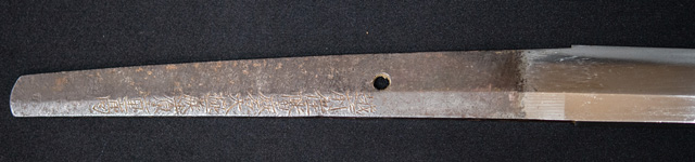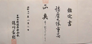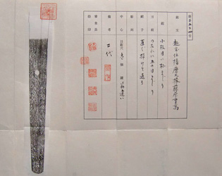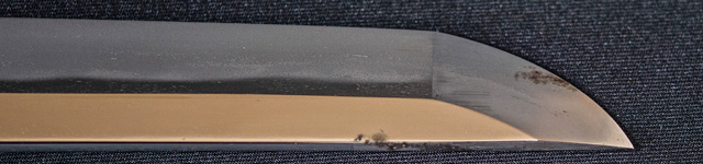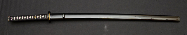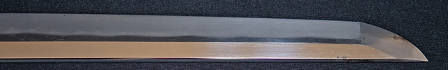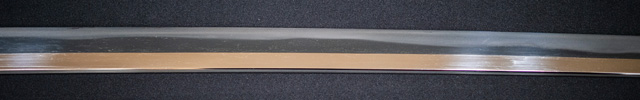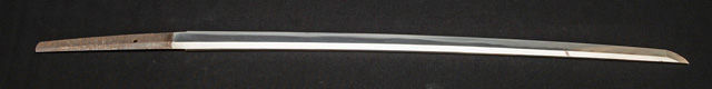 刀長 74.0cm(2尺4寸4分) 反り 1.06cm(3分5厘) 元幅 3.16cm 先幅 2.47cm 元重 7.0mm 先重 5.2mm  刀身重量 裸身  870g  鞘を払って 1,160g  茎 少し区送る 目釘穴 1刃文 物打互ノ目中よりのたれ刃 価格
