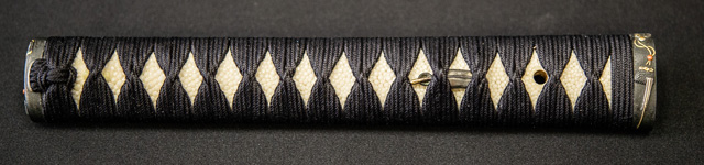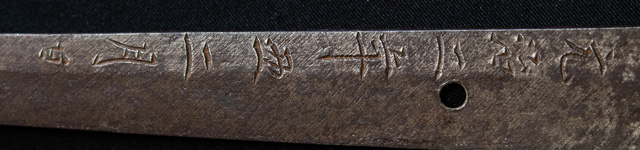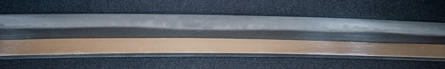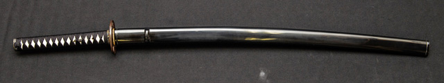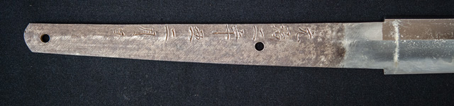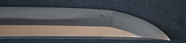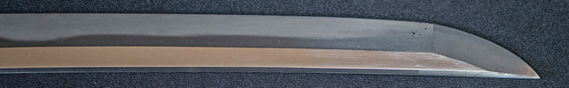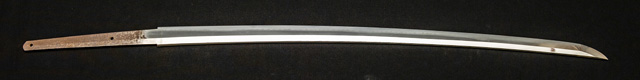 | 刀長 74.5cm(2尺4寸6分) 反り 1.7cm(5分6厘) 元幅 3.44cm 先幅 2.69cm 元重 6.6mm 先重 5.0mm 刀身重量裸身850g 鞘を払って 1,200g 茎 生 目釘穴 2 刃文 互ノ目乱 |