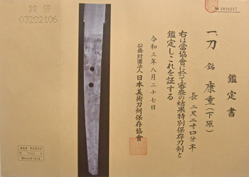 下原刀の本家康重である。山本内紀と称す。天文頃北条氏康から康の字を賜り、周重を康重と改名した。本作は初代の康重で地金も杢目肌良く錬れ刃紋乱刃で刃が冴え出来が良く八王子の方にお薦めする。