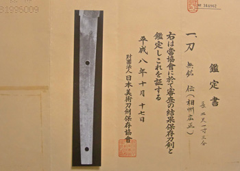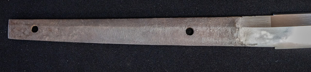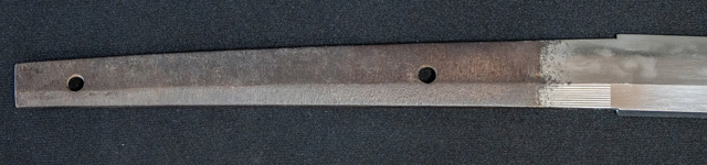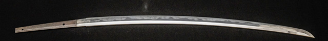 | 刀長 64.5cm(2尺1寸3分) 反り 2.0cm(6分5厘) 元幅 2.73cm 先幅 2.18cm 元重 5.2mm 先重 4.3mm 刀身重量裸身600g 茎 摺上 目釘穴 2 刃文 互ノ目丁子 |