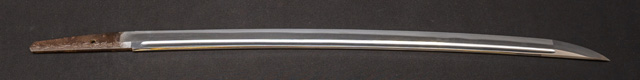 刀長 54.2cm(1尺7寸9分) 反り 0.8(2分6厘) 元幅 2.78cm 先幅 2.57cm 元重 6.3mm先重 5.4mm重量 裸身 500g 目釘穴 1 刃文 互ノ目乱 価格