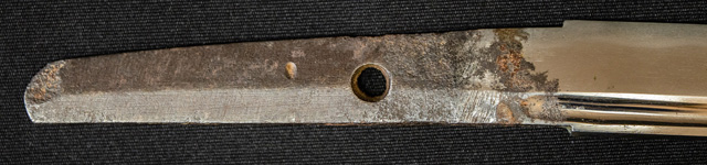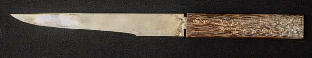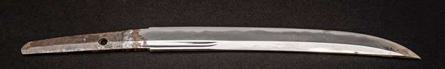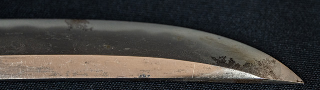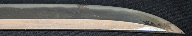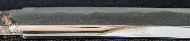 刀長 20.8cm(6寸9分) 反り0.3(1分) 元幅 2.12cm 先幅2.00cm 元重 4.9mm 先重 4.9mm 刀身重量裸身150g 目釘穴 1 刃文乱刃 価格