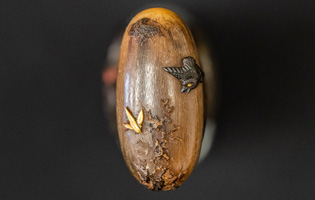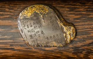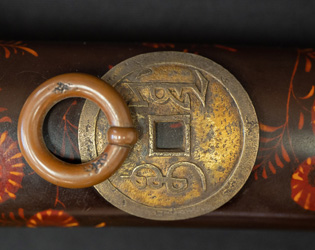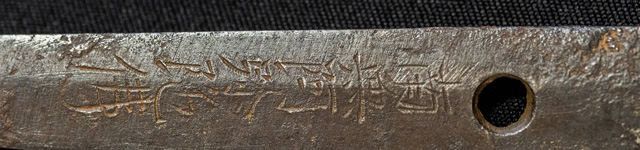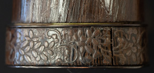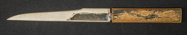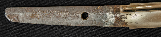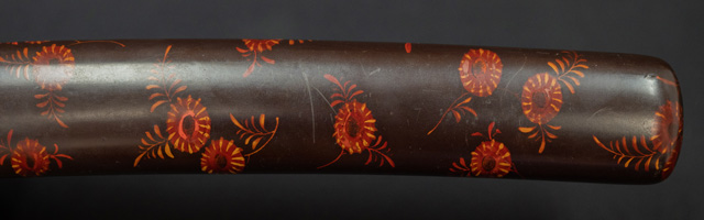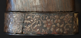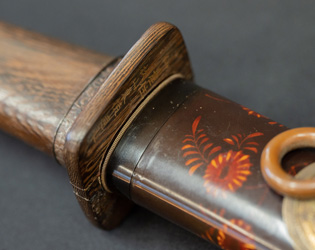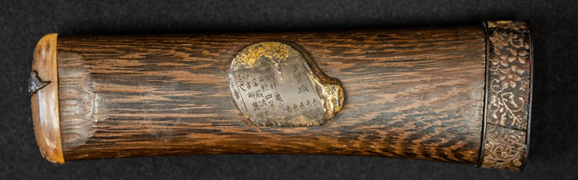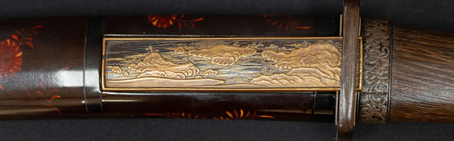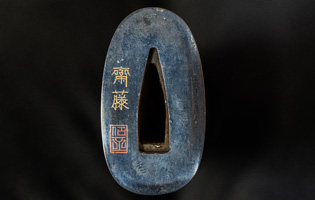 拵えが面白い。鍔が仙台住杉山束〇造之 目貫が差表が四分一で多賀城碑がほってある。(多賀城碑とは奈良時代に造られた。陸奥国の国府があった多賀城の入口に立ち724年多賀城創建と改修を伝える。その後不明になり江戸時代に発見され仙台藩が保護し現在は国の重要文化財に指定されている。)松尾芭蕉が元禄二年に訪れている。縁は木製で藤の花が彫って有り縁金が赤銅で斉藤と象嵌されている。小柄は大小柄で鉄刀木製で金蒔絵で金華山が描かれている。目貫の差裏には古代木で駒の図か