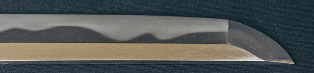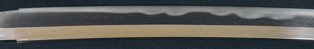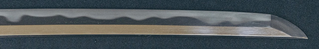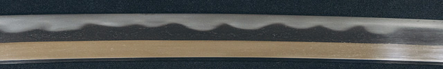 三代金道の初期作なり。地金残繰りと肌立ち、刃紋大互ノ目乱、沸出来、足入り刃冴える。三品勘兵衛と称す。