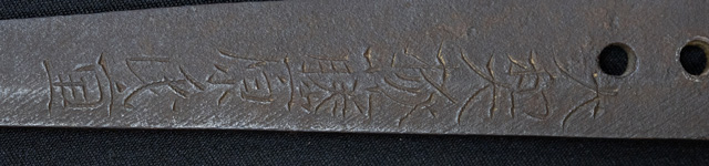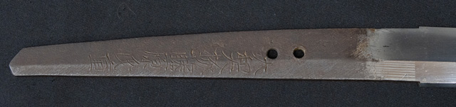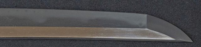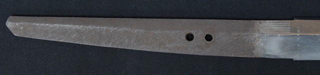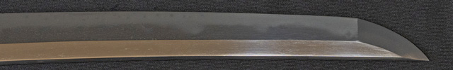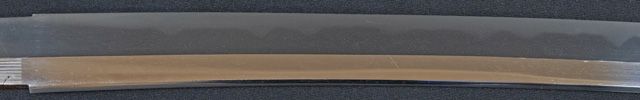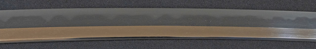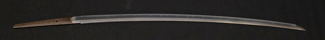 | 刀長 68.9cm(2尺2寸7分) 反り 2.0cm(6分5厘) 元幅 3.02cm 先幅 2.18cm 元重 6.8mm 先重 4.7mm 刀身重量裸身660g 鞘を払って990g 茎 生 目釘穴 2 刃文 乱刃 |