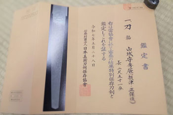 | 相模守政常門 得印派 長く豪壮な刀である。地金小杢肌良く約む 刃小沸出来のたれ刃の山の部分が沸島、葉足盛んに入る。 |