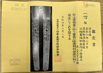 | 刀 銘 源正雄安政六年八月日 為西野源祐寿嘱 以蝦夷地岩内砂鉄造之 |