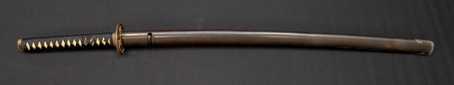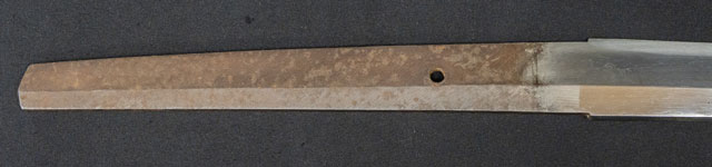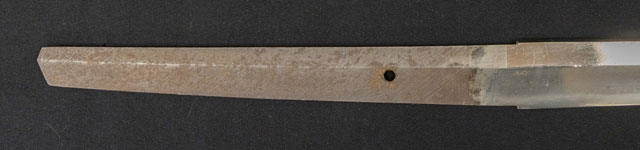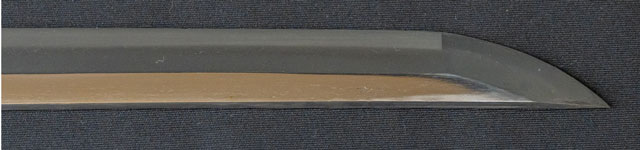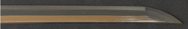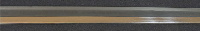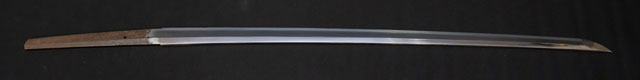 | 刀長 74.5cm(2尺4寸6分) 反り 0,9cm(3分-厘) 元幅 3.20cm 先幅 2.43cm 元重 8.7mm 先重 5.9mm 刀身重量裸身-g 鞘を払って1,240g 茎 生 目釘穴 1 刃文 直刃 |