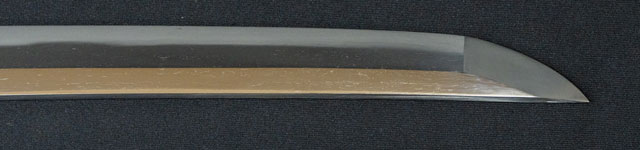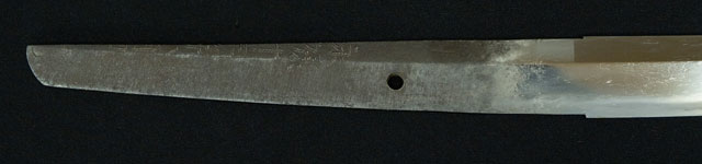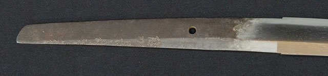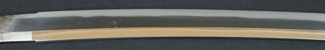 | 地金小杢肌に杢目肌交り僅かに肌立つ。刃紋直刃匂い出来小足さかんに入り沸島入る。茎の銘が削られているのは江戸寛文年間に試斬り使用時に反りを浅くする為に茎を削ったのであろう。 |