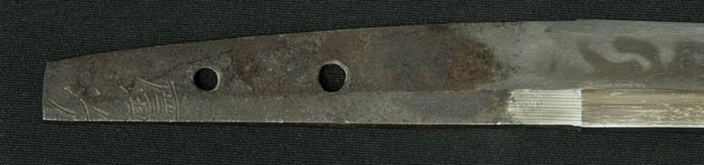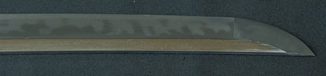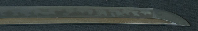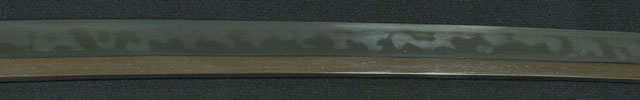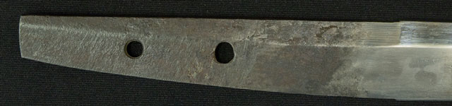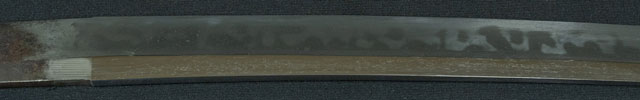 | 刀長 43.1cm(1尺4寸2分) 反り 0.8cm(2分6厘) 元幅 2.62cm 先幅 2.18cm 元重 5.2mm 先重 4.4mm 刀身重量裸身340g 鞘を払って520g 茎 摺上 目釘穴 2 刃文 大乱 |