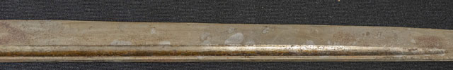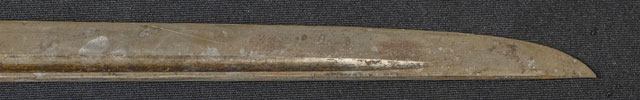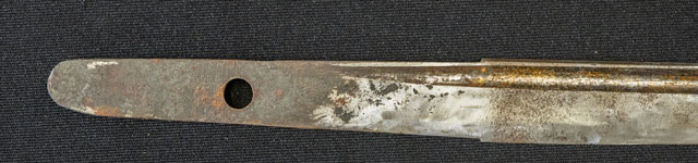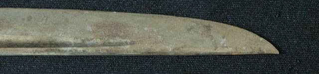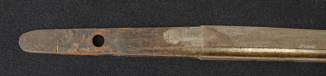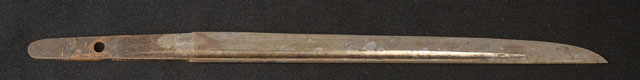 刀長 24.0cm(‐尺8寸) 反り 0.2.cm(-分9厘) 元幅 1.84cm 先幅 1.51cm 元重 5.0mm 先重 4.0mm 刀身重量裸身‐g 鞘を払ってg 生 目釘穴 1  刃文 不明 価格