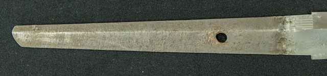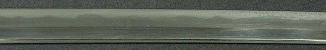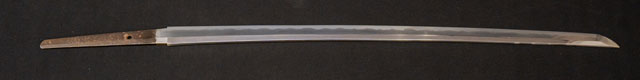 | 刀長 70.2cm(2尺3寸2分) 反り 0.9cm(3分-厘) 元幅 3.16cm 先幅 2.41cm 元重 7.1mm 先重 4.6mm 刀身重量裸身740g 鞘を払って-g 茎 生 目釘穴 1 刃文 乱刃 |